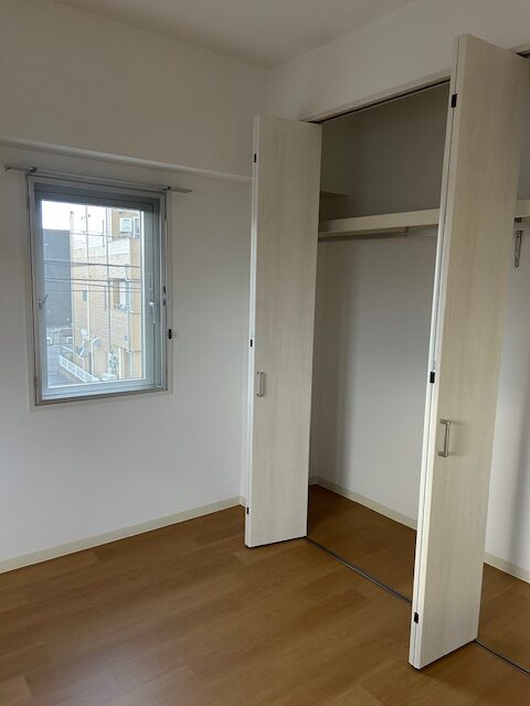 床はLDKとの段差を無くして東リLAYフローリング、和室っぽい装飾は全て撤去し洋室仕様に、白木の窓枠塗装は白系のツヤ無しマット仕上げ、クローゼットはLIXILラシッサSクリエアイボリーH2300のW2550のオーダー品です。