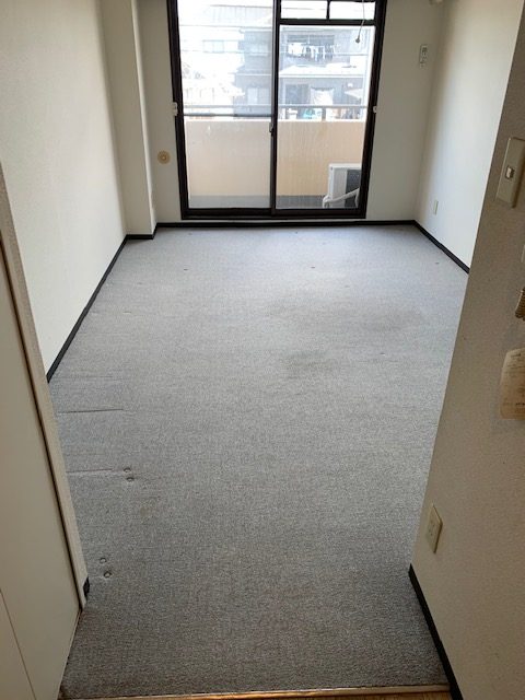 カーペットの居室、汚れと凹み部分があるので貼り替えです、カーペットではなくクッションフロアで!