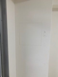 賃貸マンション、エアコンの配管が隠ぺいタイプの為、今後の取り替えの事を想定して壁面に点検口設置しました、サイズは300×300ミリ